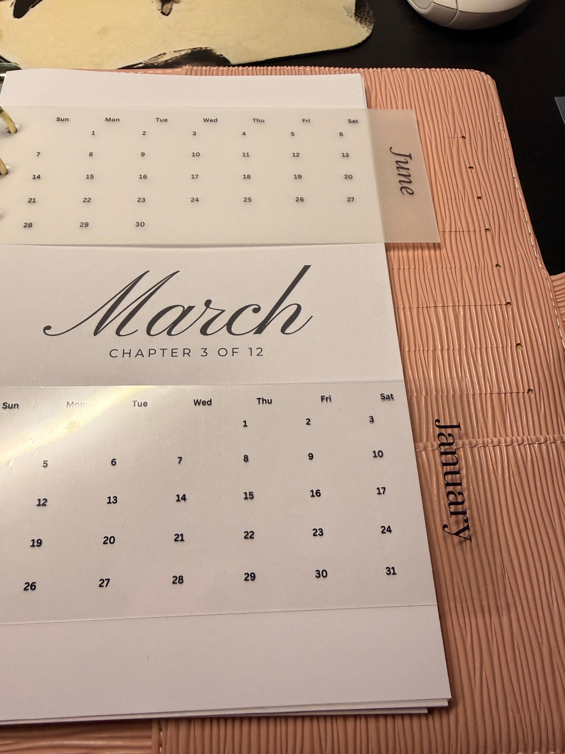 • Each card includes a monthly calendar + tab-style layout